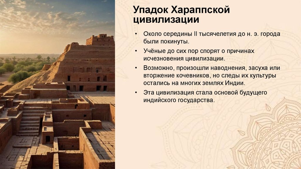 • Главные города — Хараппа и Мохенджо-Даро• были построены из красного обожжённого