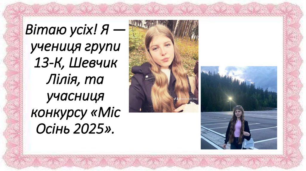 1. Вітаю усіх! Я — учениця групи 13-К, Шевчик Лілія, та учасниця конкурсу «Міс Осінь 2025».