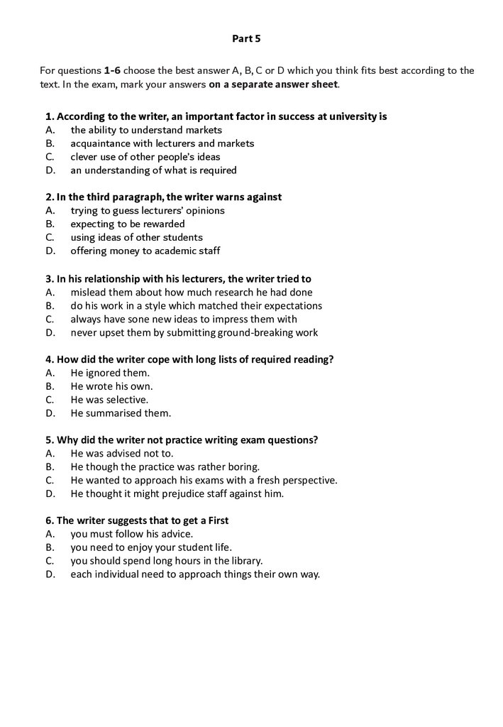 Part 5For questions 1-6 choose the best answer A, B, C or D which you think fits best according to the