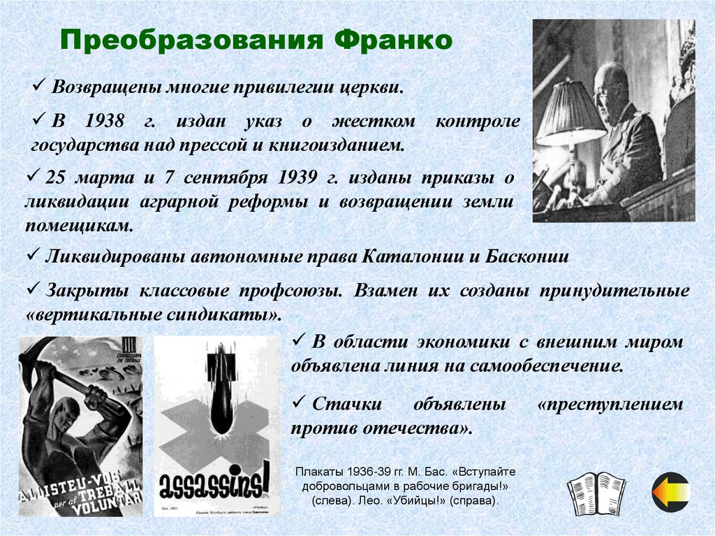 Преобразования ФранкоВозвращены многие привилегии церкви.