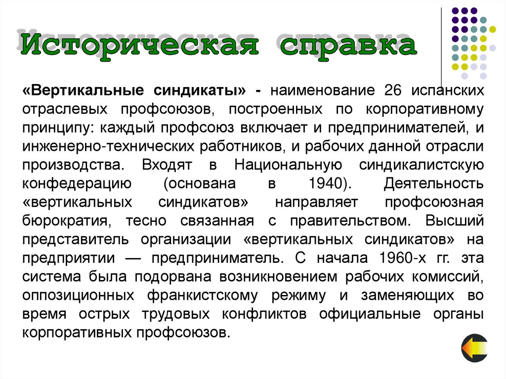 «Вертикальные синдикаты» - наименование 26 испанскихотраслевых профсоюзов, построенных по корпоративному