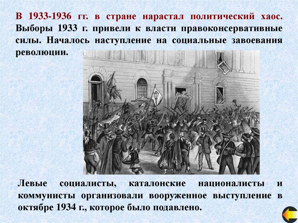 В 1933-1936 гг. в стране нарастал политический хаос.Выборы 1933 г. привели к власти правоконсервативные