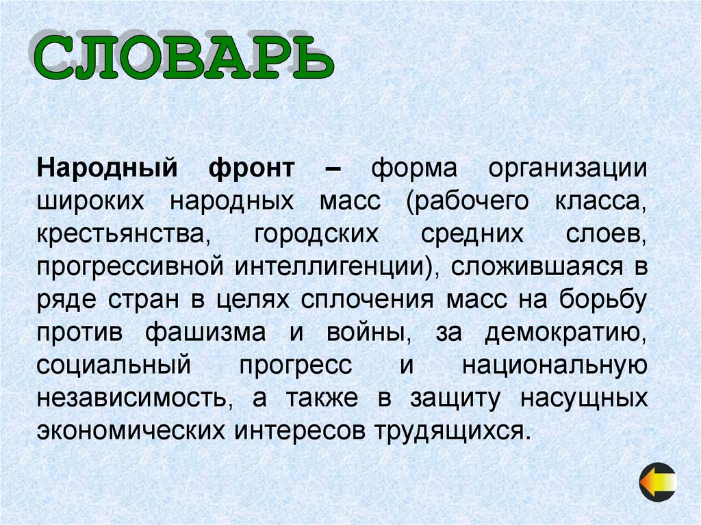 Народный фронт – форма организациишироких народных масс (рабочего класса,