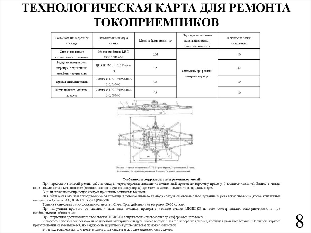 Для облегчения очистки токоприемника от гололеда в течение зимнего периода следует смазывать рамы, пружины и рога токоприемника (кроме контактных