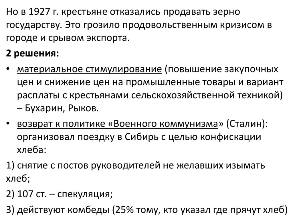 Но в 1927 г. крестьяне отказались продавать зерногосударству. Это грозило продовольственным кризисом в