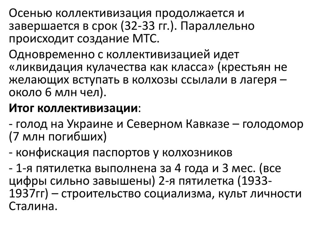 Осенью коллективизация продолжается изавершается в срок (32-33 гг.). Параллельно