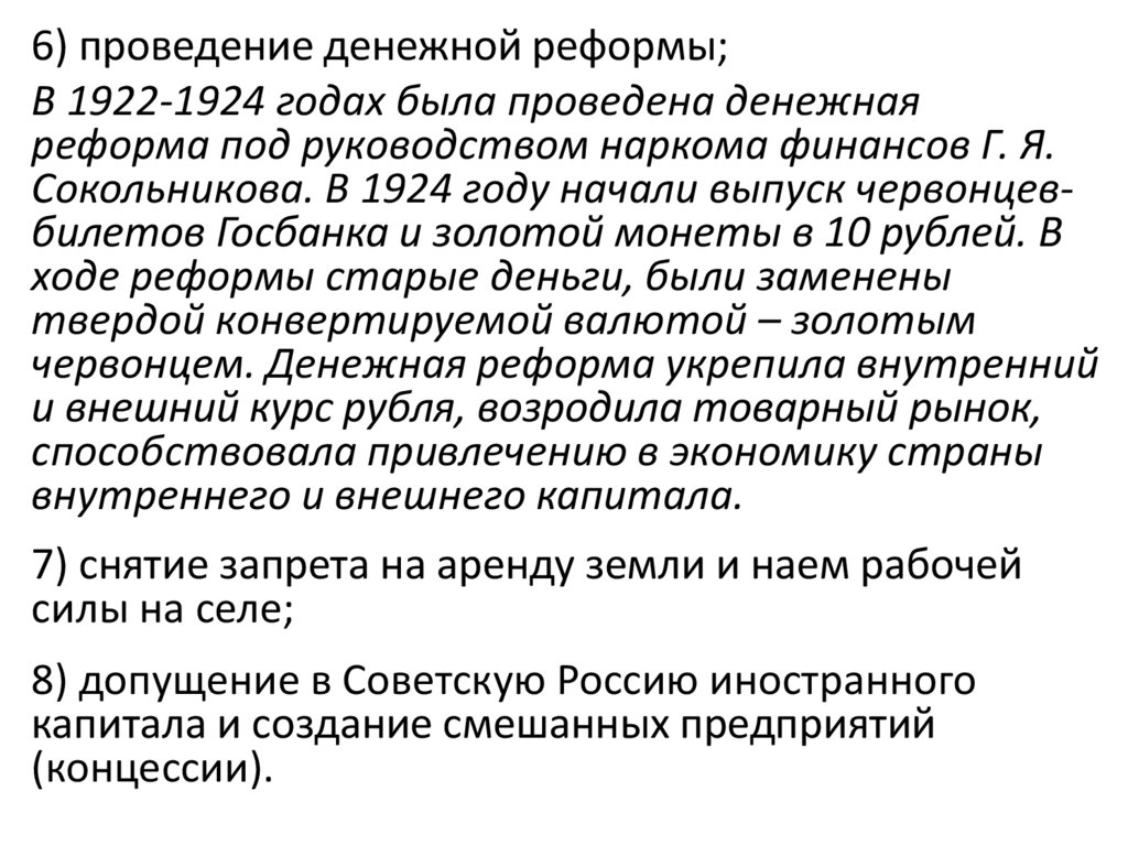 6) проведение денежной реформы;В 1922-1924 годах была проведена денежная