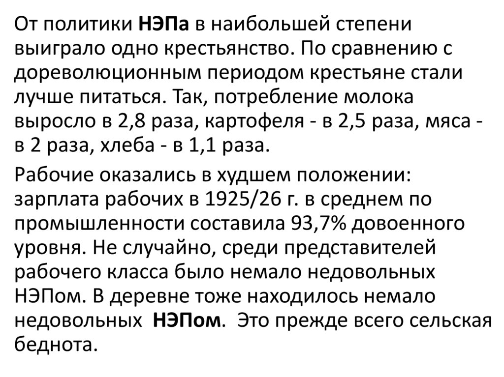 От политики НЭПа в наибольшей степенивыиграло одно крестьянство. По сравнению с
