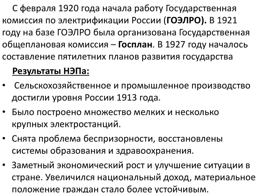 С февраля 1920 года начала работу Государственнаякомиссия по электрификации России (ГОЭЛРО). В 1921