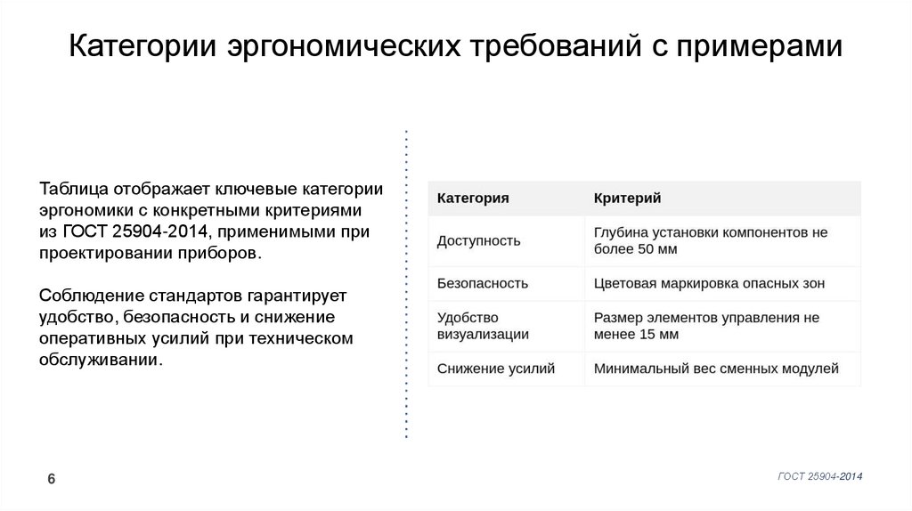 Категории эргономических требований с примерамиТаблица отображает ключевые категории