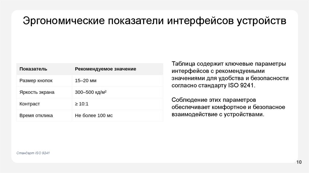 Эргономические показатели интерфейсов устройствТаблица содержит ключевые параметры