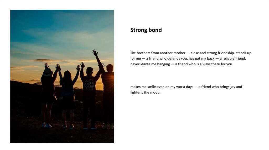 Strong bondlike brothers from another mother — close and strong friendship. stands up