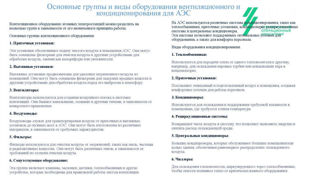 Основные группы и виды оборудования вентиляционного икондиционирования для АЭС
