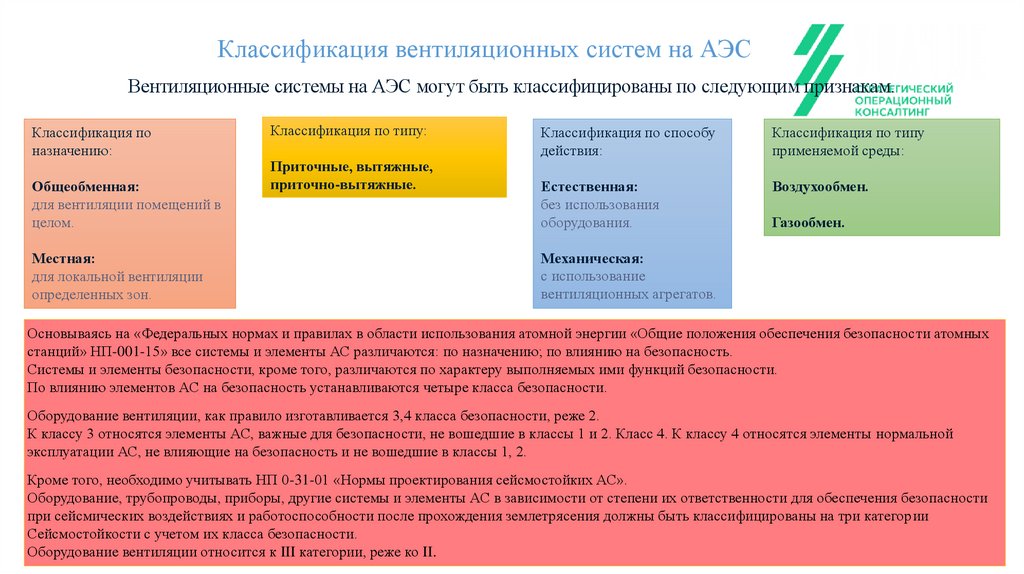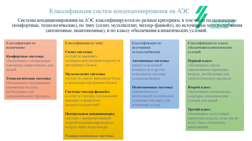 Классификация систем кондиционирования на АЭССистемы кондиционирования на АЭС классифицируются по разным критериям, в том числе по назначению