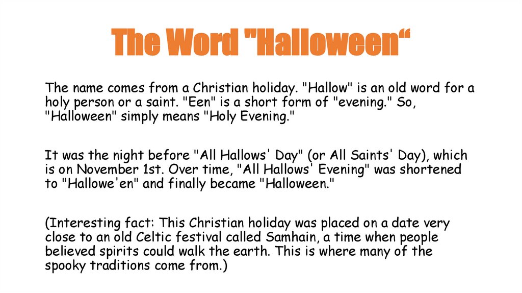 The Word "Halloween“The name comes from a Christian holiday. "Hallow" is an old word for a