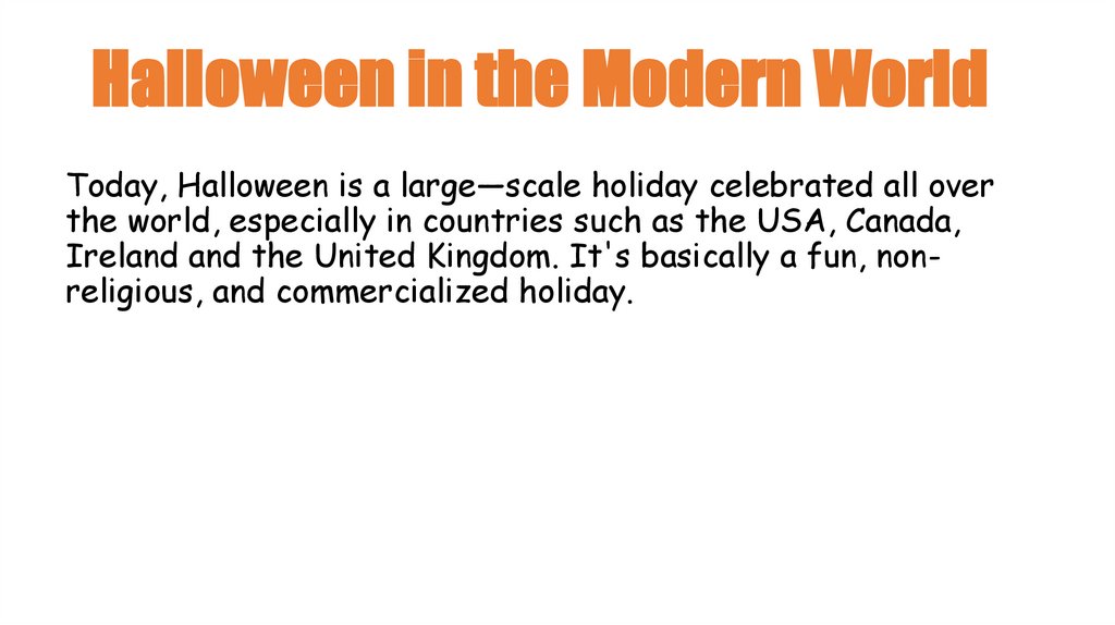 Halloween in the Modern WorldToday, Halloween is a large—scale holiday celebrated all over