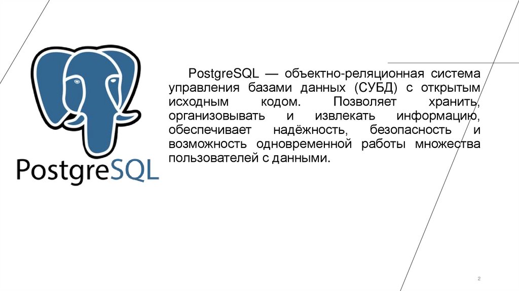 PostgreSQL — объектно-реляционная системауправления базами данных (СУБД) с открытым