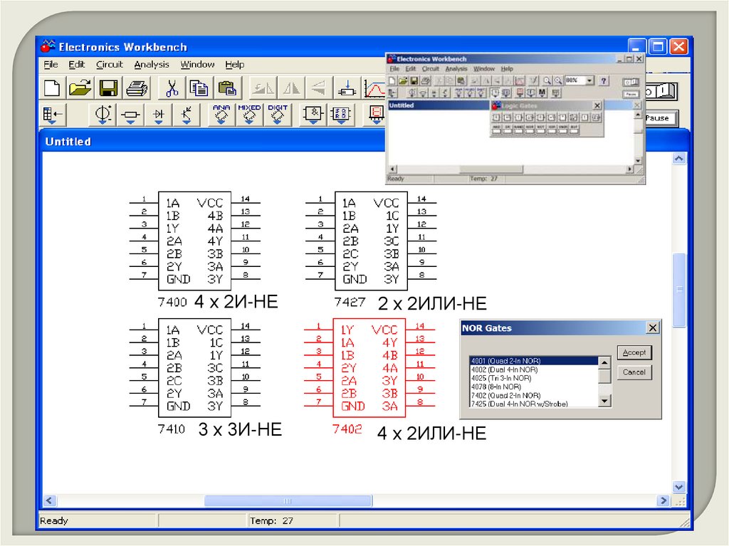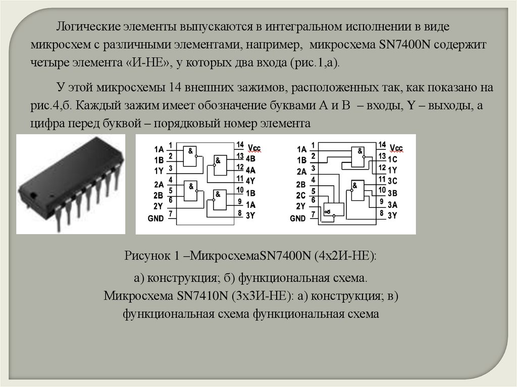Логические элементы выпускаются в интегральном исполнении в видемикросхем с различными элементами, например, микросхема SN7400N содержит