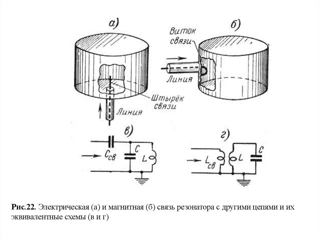 Рис.22. Электрическая (а) и магнитная (б) связь резонатора с другими цепями и ихэквивалентные схемы (в и г)
