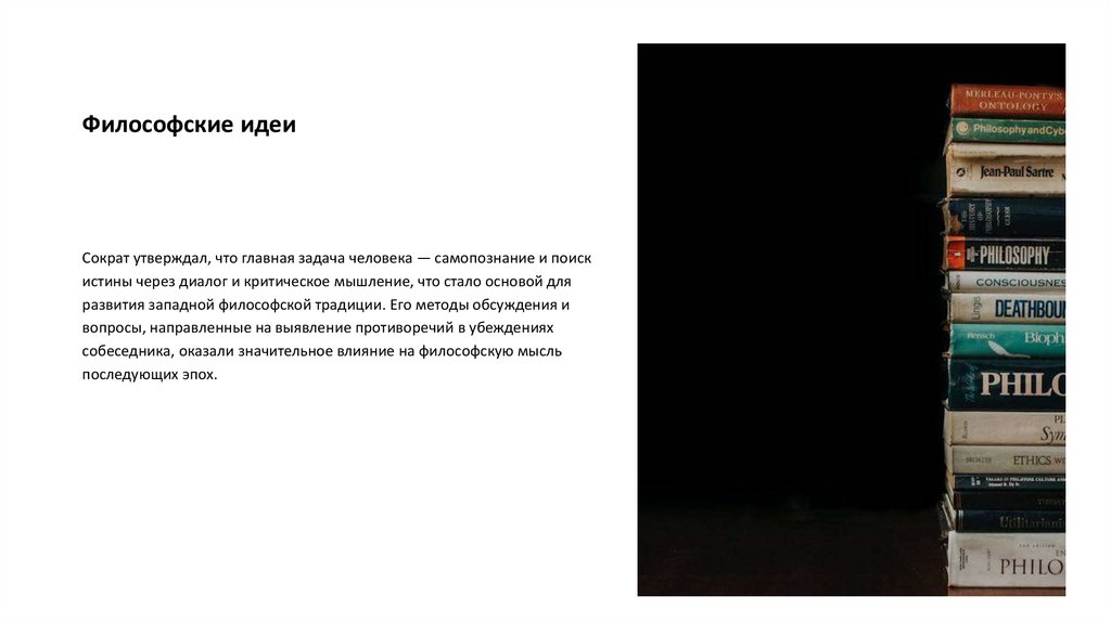 Философские идеиСократ утверждал, что главная задача человека — самопознание и поиск