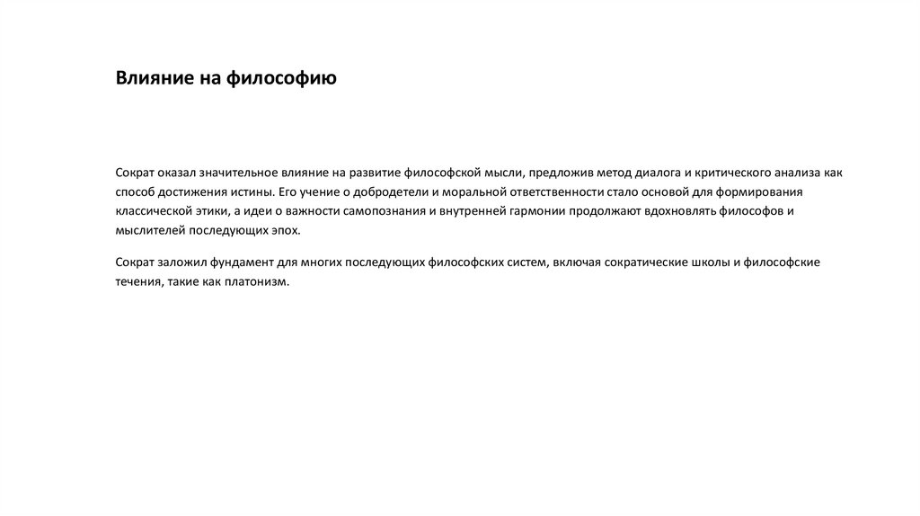Влияние на философиюСократ оказал значительное влияние на развитие философской мысли, предложив метод диалога и критического анализа как