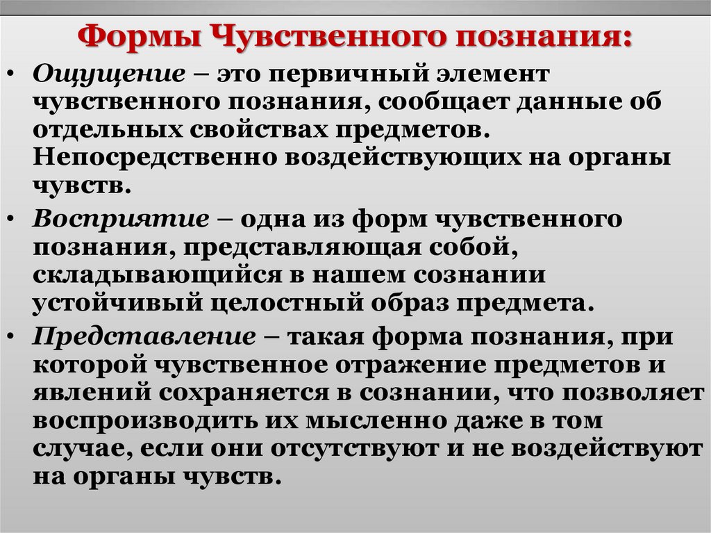 Формы Чувственного познания:• Ощущение – это первичный элемент
