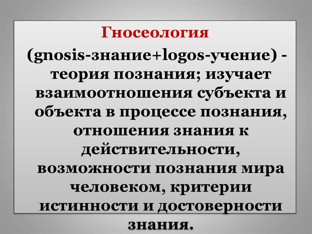 Гносеология(gnosis-знание+logos-учение) теория познания; изучает