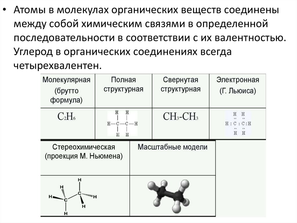 • Атомы в молекулах органических веществ соединенымежду собой химическим связями в определенной