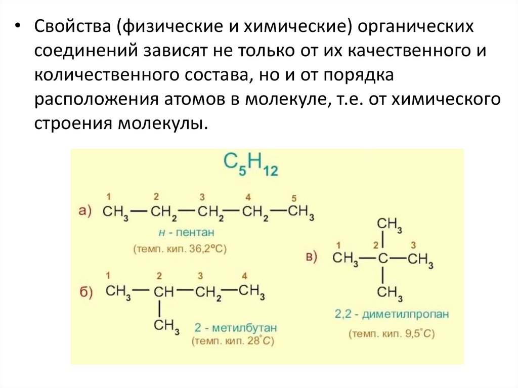 • Свойства (физические и химические) органическихсоединений зависят не только от их качественного и