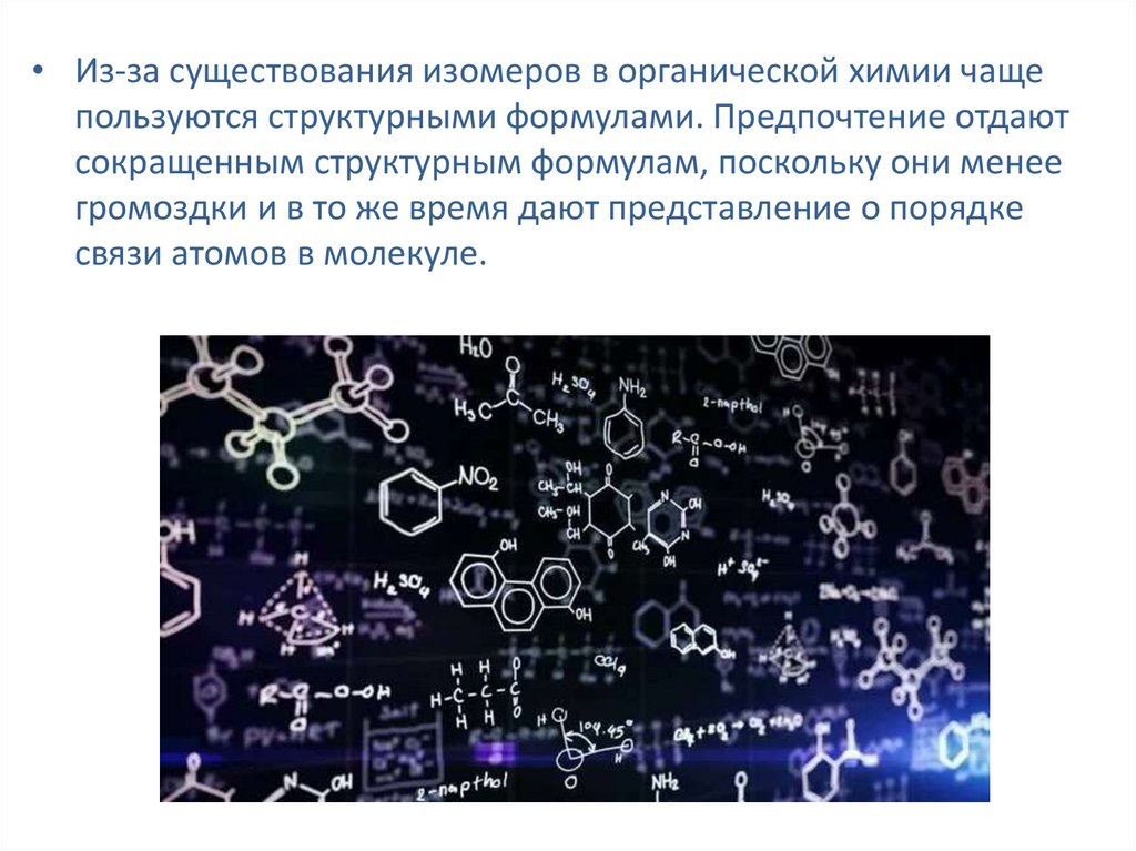 • Из-за существования изомеров в органической химии чащепользуются структурными формулами. Предпочтение отдают