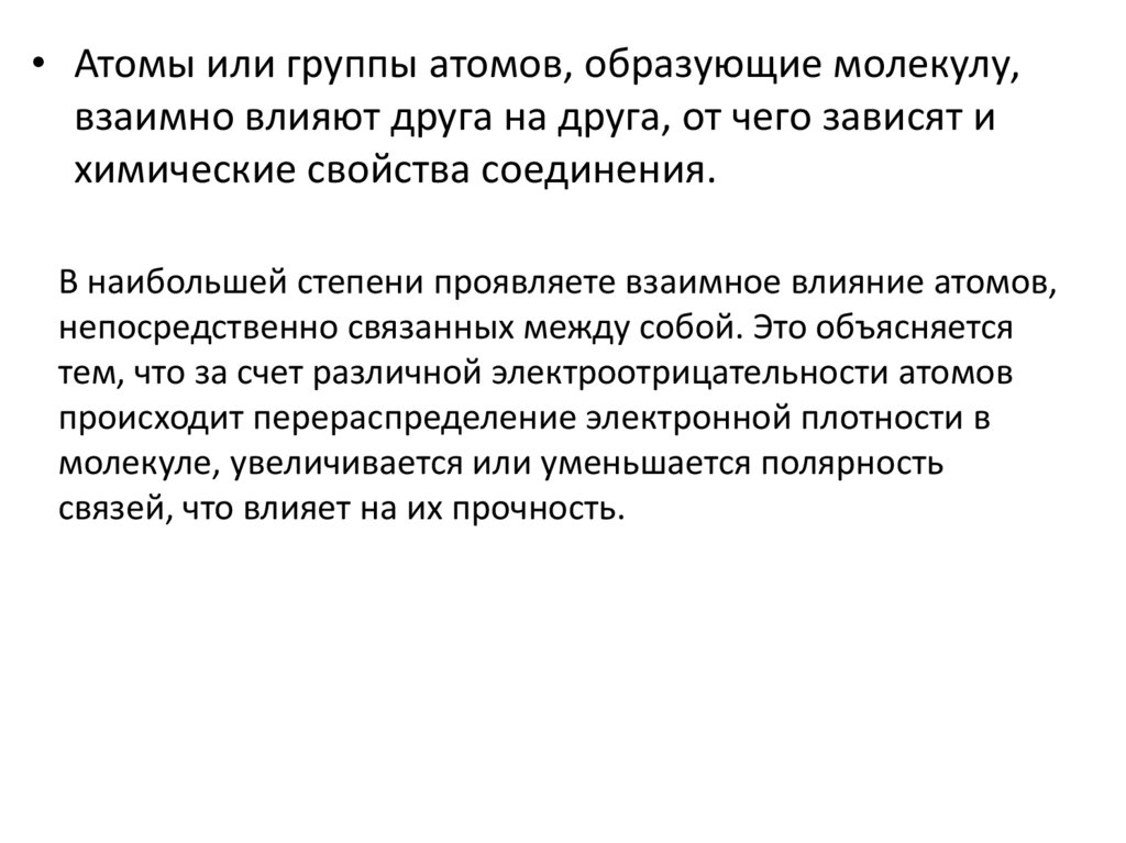 • Атомы или группы атомов, образующие молекулу,взаимно влияют друга на друга, от чего зависят и