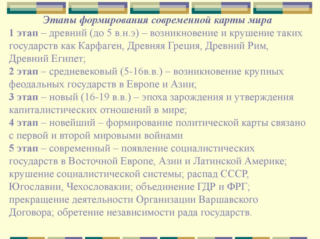 Этапы формирования современной карты мира1 этап – древний (до 5 в.н.э) – возникновение и крушение таких