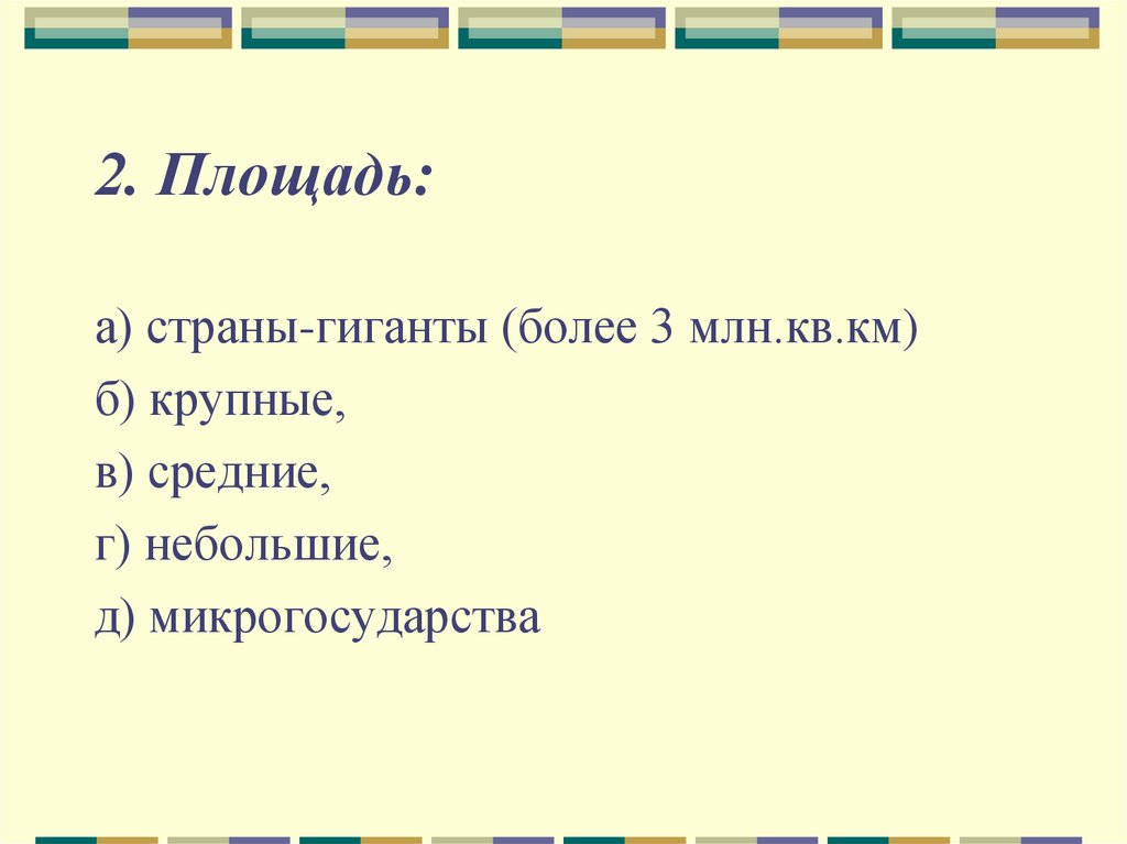 2. Площадь:а) страны-гиганты (более 3 млн.кв.км)