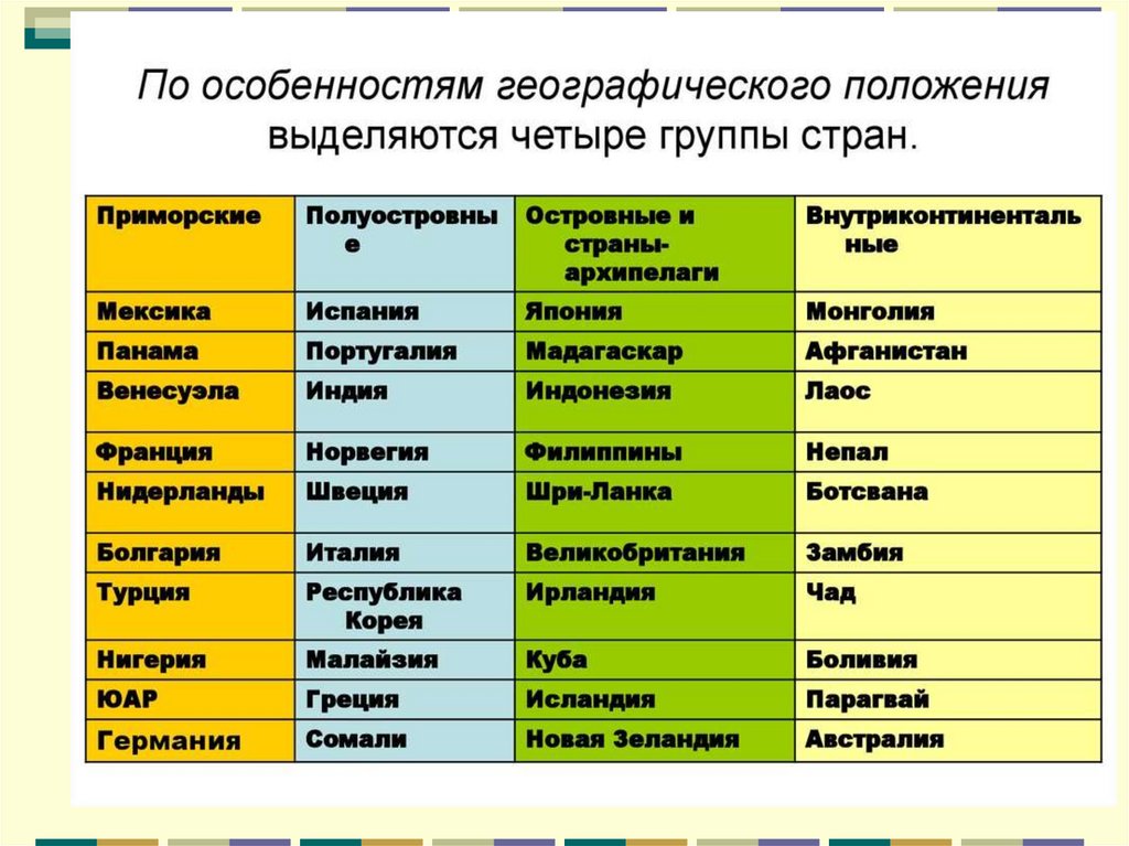 9. 4. Географическое положение: а) имеют выход к морю (островные, страны-архипелаги, полуостровные, прибрежные) б)