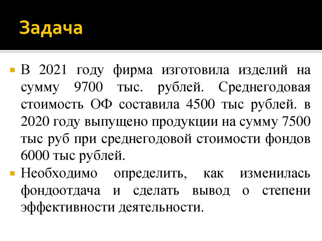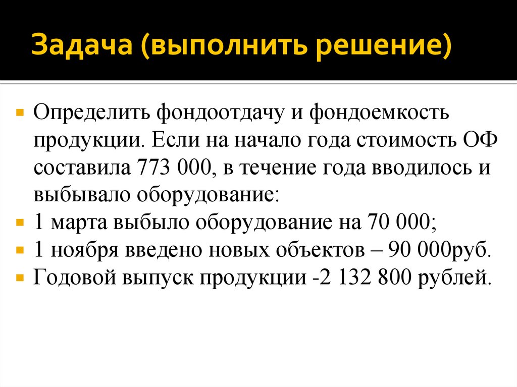 Задача (выполнить решение)Определить фондоотдачу и фондоемкость