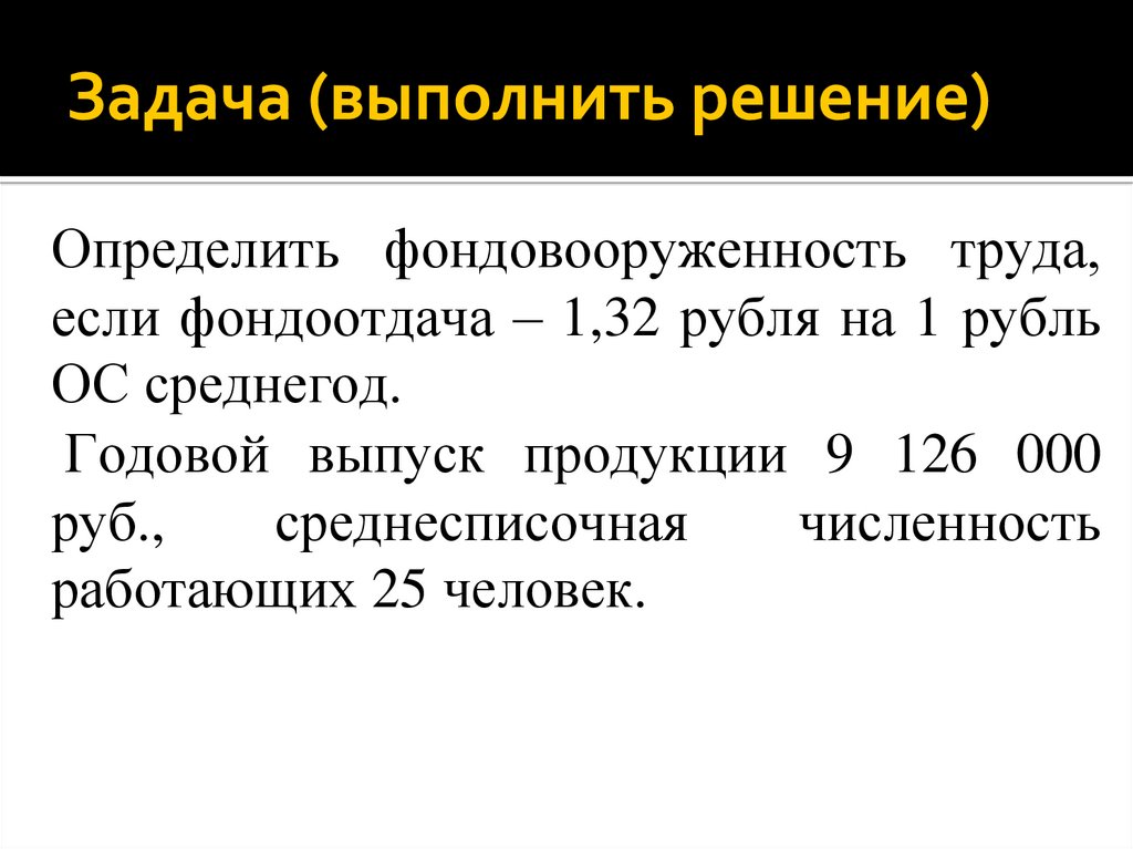 Задача (выполнить решение)Определить фондовооруженность труда,