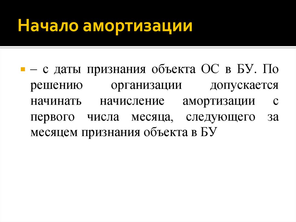 Начало амортизации– с даты признания объекта ОС в БУ. По