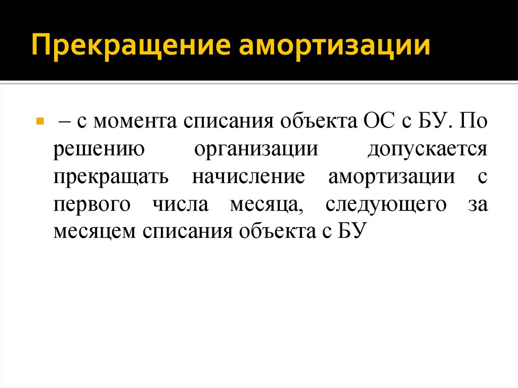 Прекращение амортизации– с момента списания объекта ОС с БУ. По
