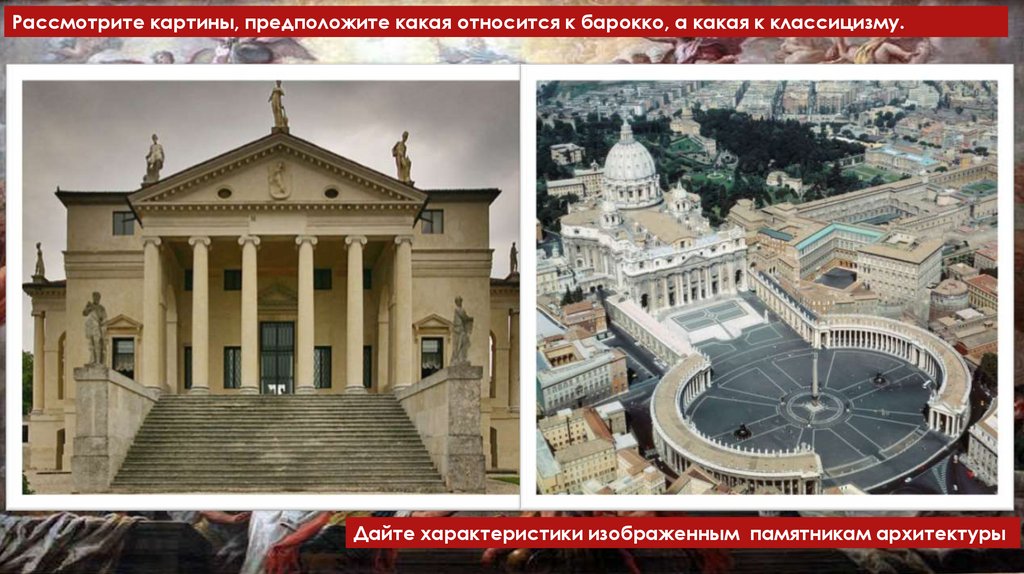 Рассмотрите картины, предположите какая относится к барокко, а какая к классицизму.Дайте характеристики изображенным памятникам архитектуры