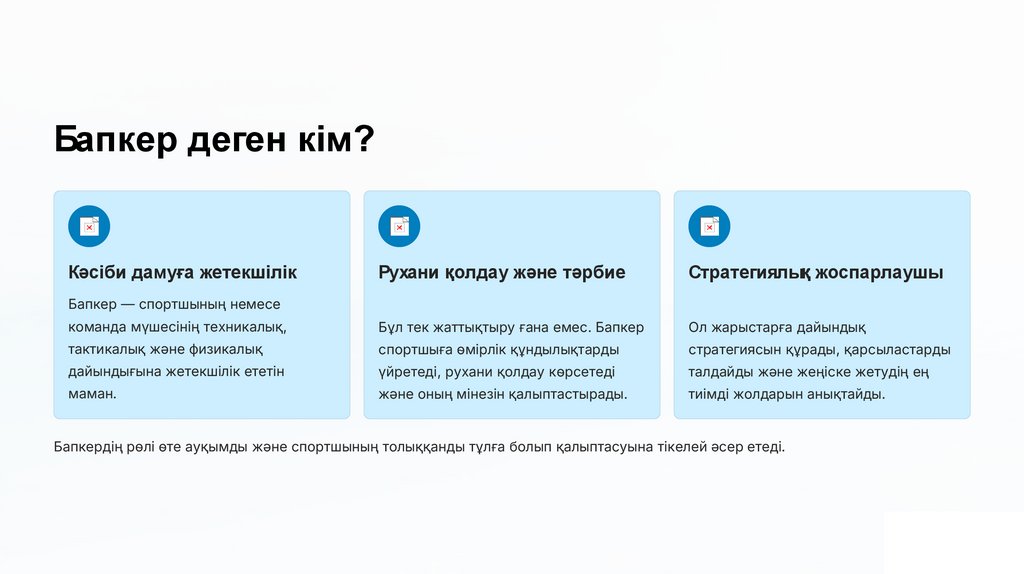 Бапкердің негізгі міндеттеріКүнделікті жұмыста бапкер бірнеше маңызды бағытты қамтиды, бұл оның