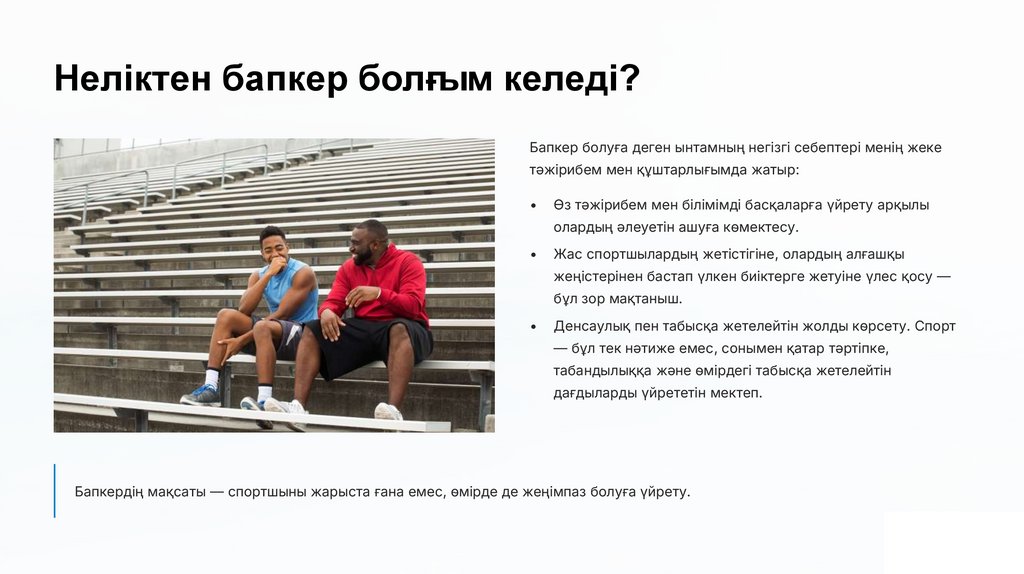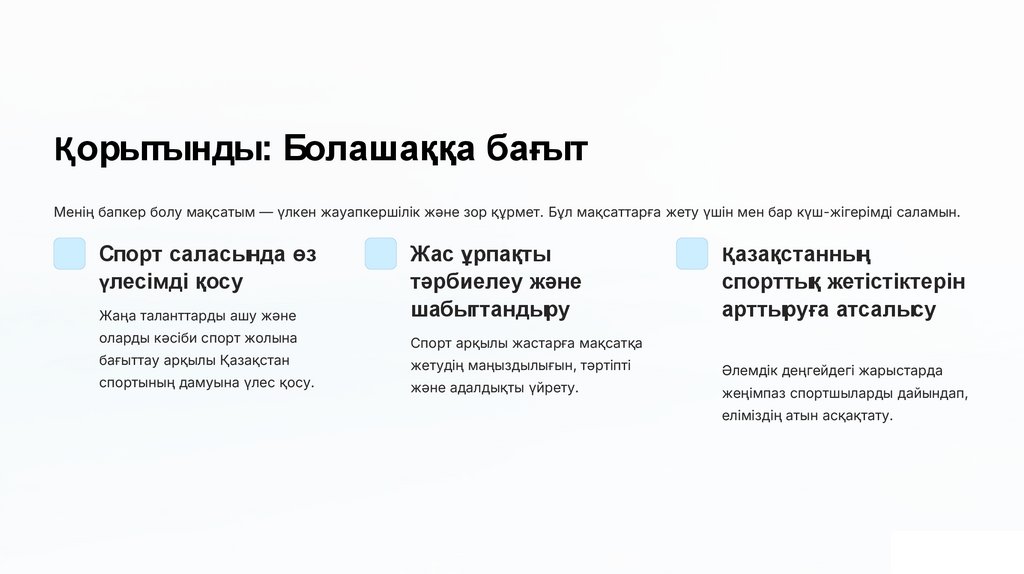 Қорытынды: Болашаққа бағытМенің бапкер болу мақсатым — үлкен жауапкершілік және зор құрмет. Бұл мақсаттарға жету үшін мен бар күш-жігерімді саламын.