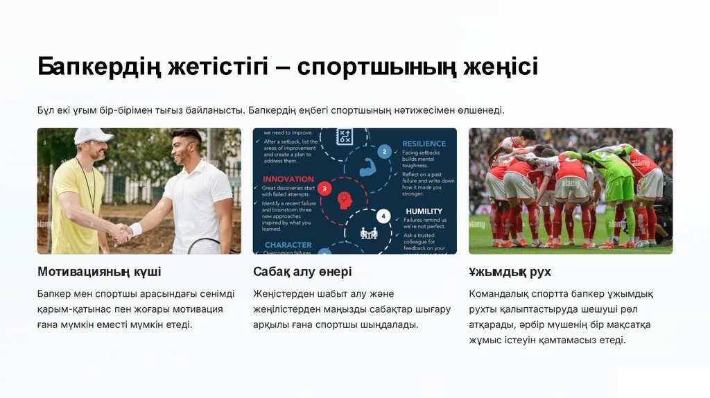 Бапкердің жетістігі – спортшының жеңісіБұл екі ұғым бір-бірімен тығыз байланысты. Бапкердің еңбегі спортшының нәтижесімен өлшенеді.