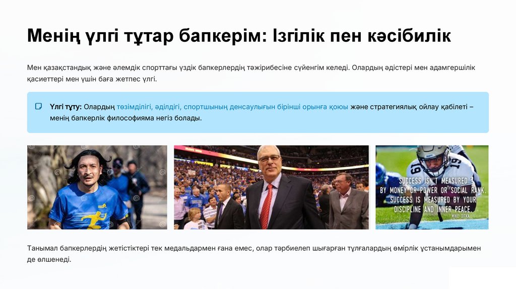 Менің үлгі тұтар бапкерім: Ізгілік пен кәсібилікМен қазақстандық және әлемдік спорттағы үздік бапкерлердің тәжірибесіне сүйенгім келеді. Олардың әдістері мен адамгершілік