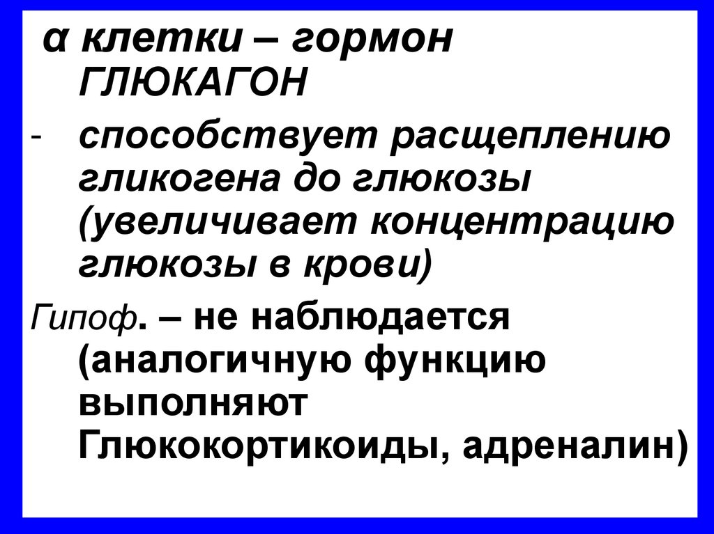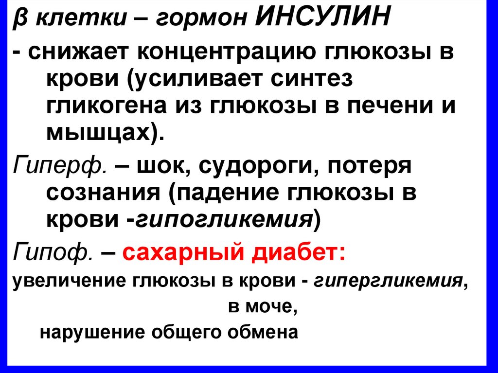 β клетки – гормон ИНСУЛИН- снижает концентрацию глюкозы в