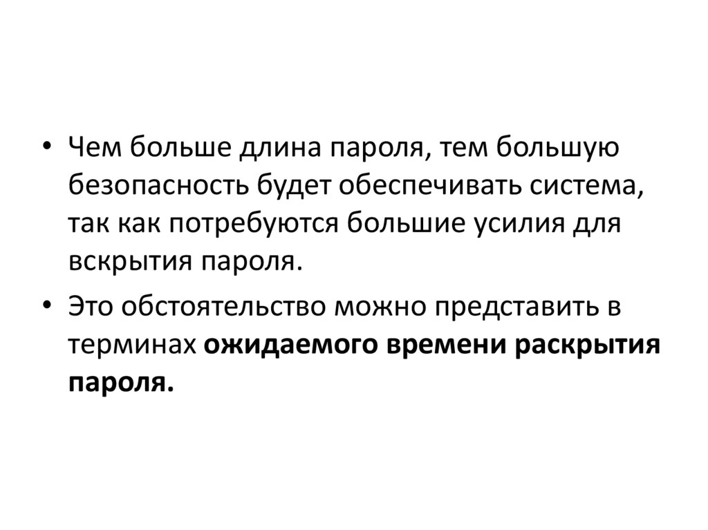 • Чем больше длина пароля, тем большуюбезопасность будет обеспечивать система,