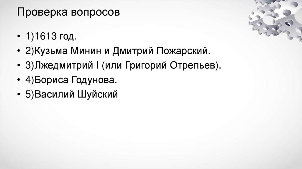 Проверка вопросов• 1)1613 год.