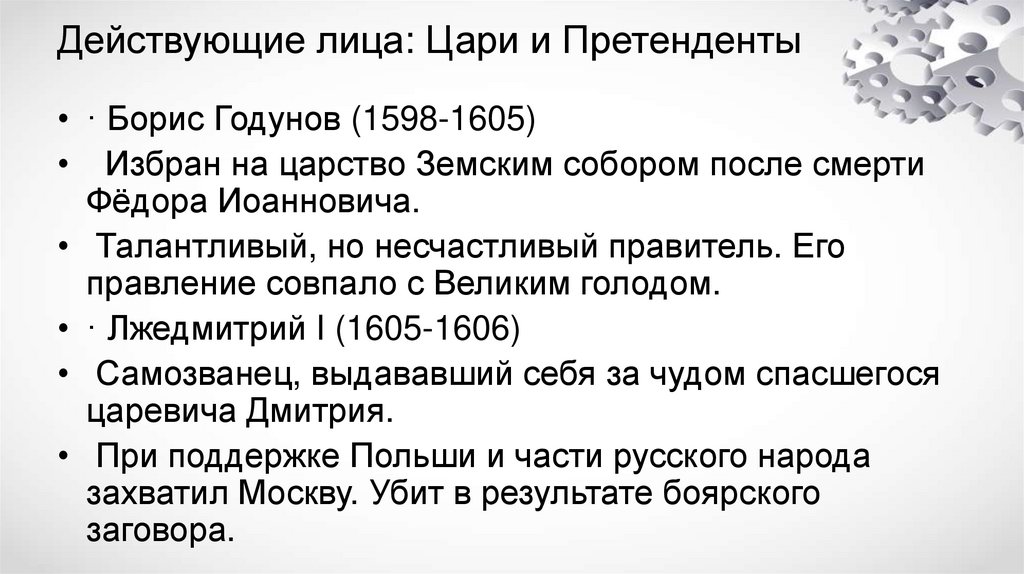 Действующие лица: Цари и Претенденты• · Борис Годунов (1598-1605)