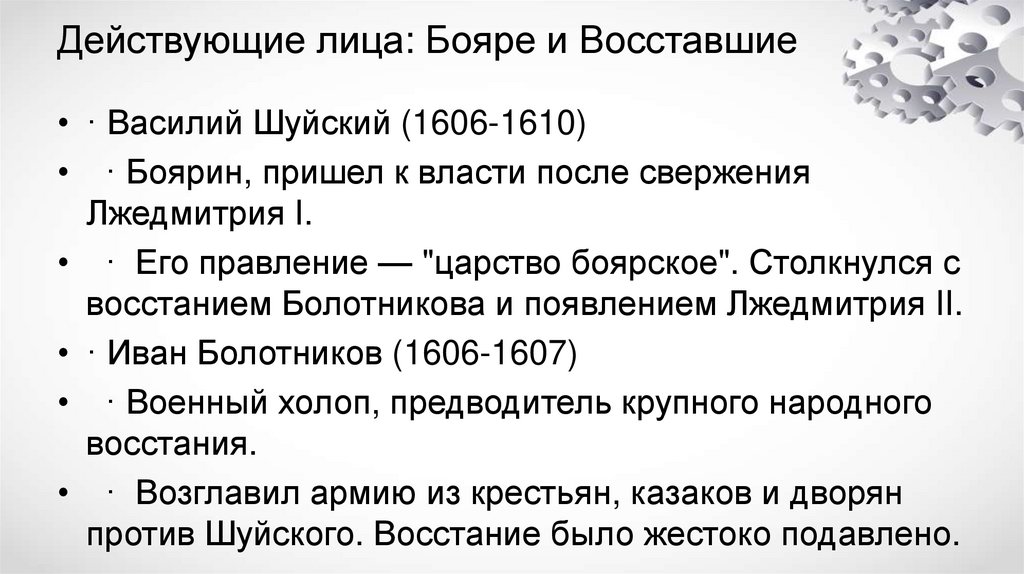 Действующие лица: Бояре и Восставшие• · Василий Шуйский (1606-1610)