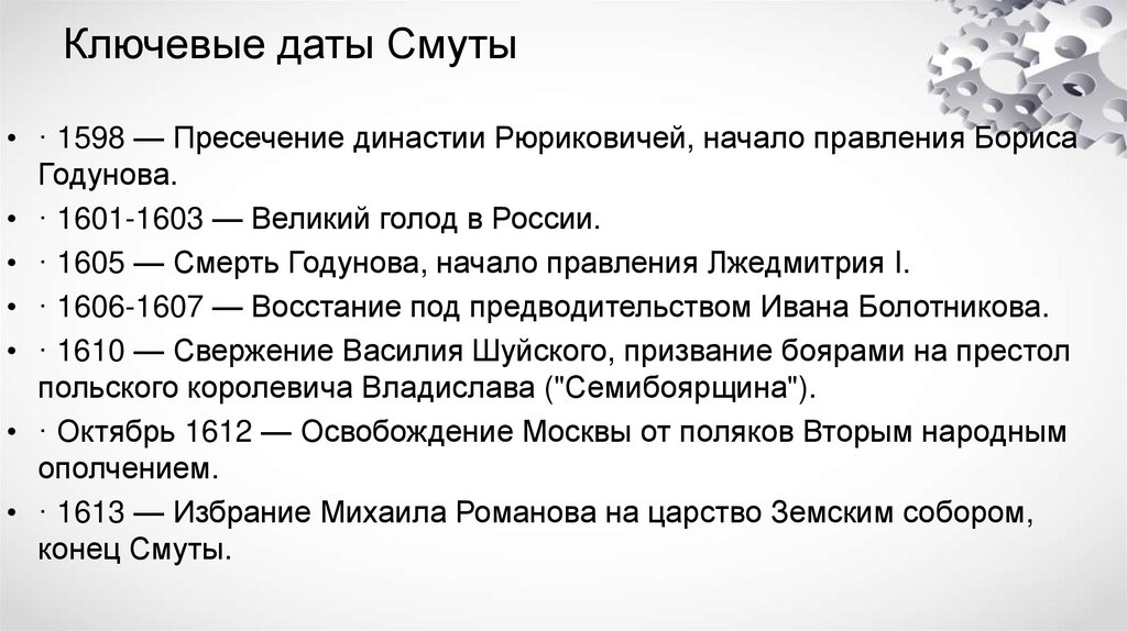 Ключевые даты Смуты• · 1598 — Пресечение династии Рюриковичей, начало правления Бориса