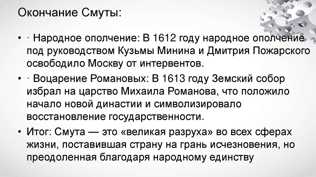Окончание Смуты:• · Народное ополчение: В 1612 году народное ополчение